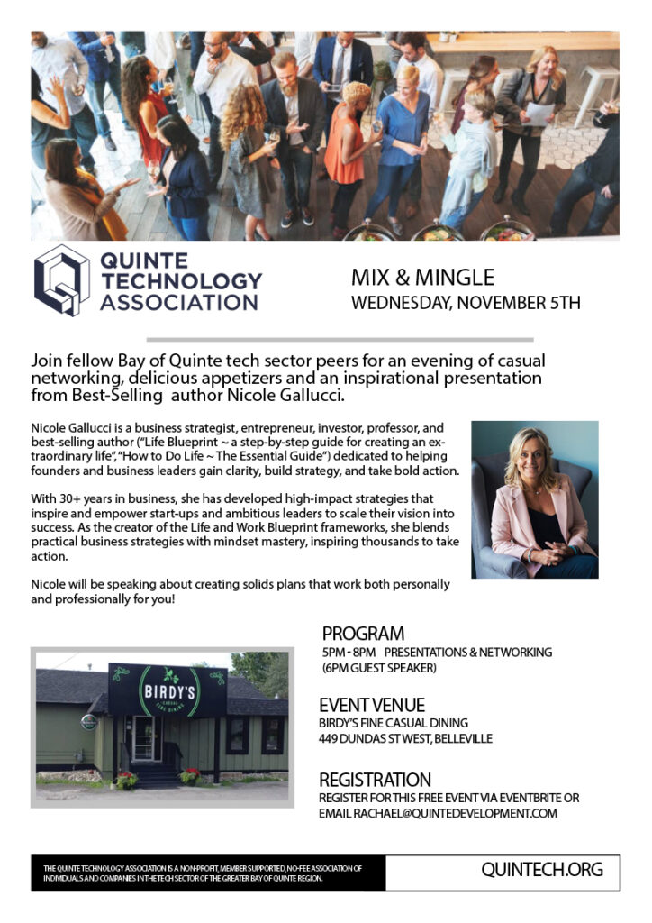 Join fellow Bay of Quinte tech sector peers for an evening of casual networking, delicious appetizers and an inspirational presentation from Best-Selling author Nicole Gallucci.